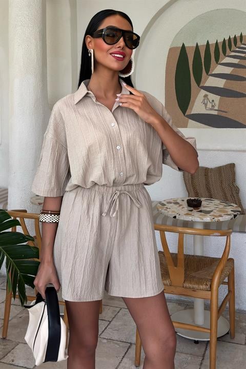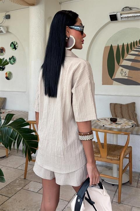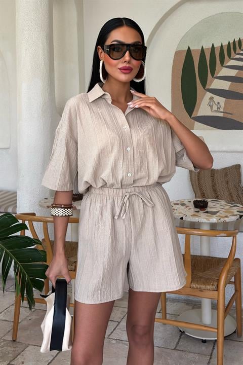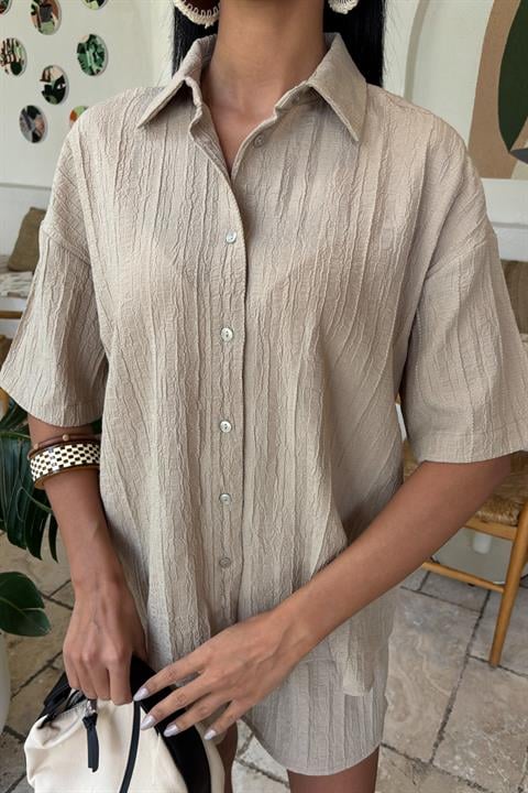Perfeita para ser combinada com saias, calças ou até mesmo calções, a camisa bege é a base perfeita para criar looks sofisticados e modernos. 🌿