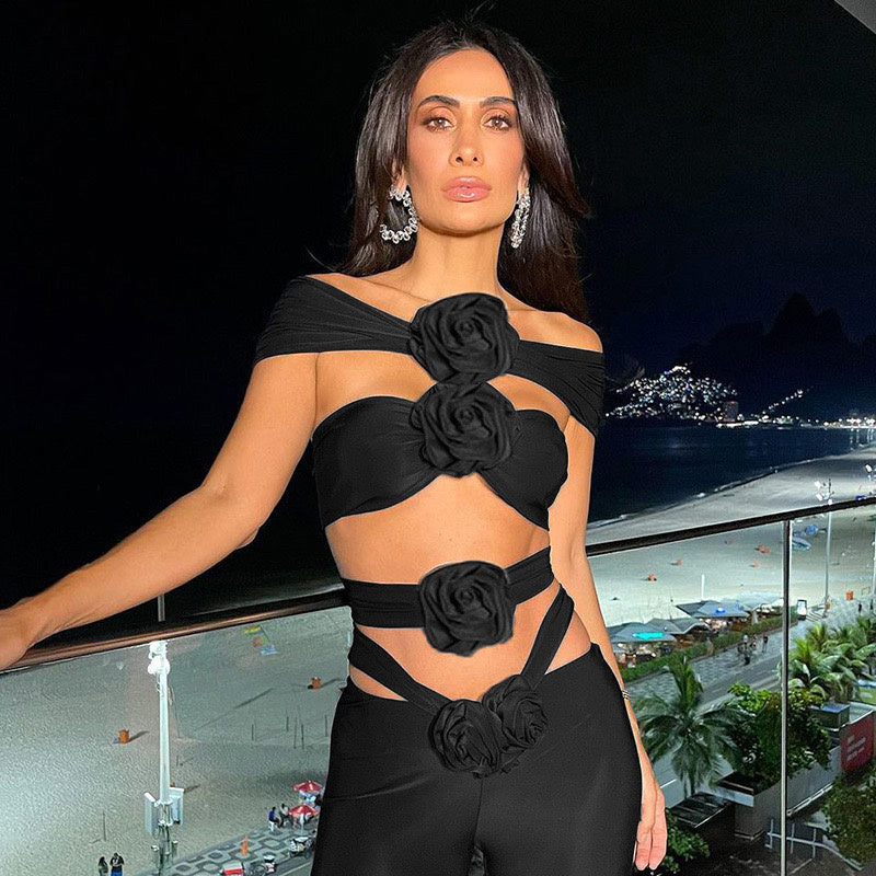 O Conjunto com flores é um look que combina sensualidade e sofisticação em preto total 🖤✨ O top com aberturas que envolvem o corpo traz um design ousado, enquanto os detalhes de flores aplicadas adicionam um toque delicado e feminino. As calças completam o conjunto com uma flor aplicada, criando uma harmonia perfeita entre sensualidade e estilo. Ideal para quem adora um visual marcante e cheio de atitude! 🌸🔥