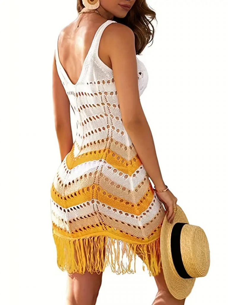 O charme artesanal que transforma qualquer look de verão! Este vestido de praia em crochet, numa combinação vibrante de amarelo e branco, é a definição de elegância descontraída. Com um design leve e trabalhado à mão, adapta-se ao corpo com um toque boho-chic irresistível. Perfeito para sobrepor ao biquíni e brilhar nos dias de sol!